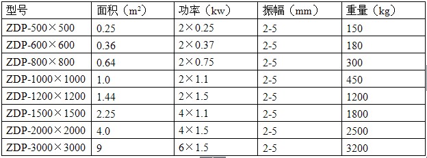 注:此表為上、下振形式振動(dòng)平臺(tái)技術(shù)參數(shù),僅供參考;此外可以根據(jù)用戶(hù)實(shí)際使用需要定做臺(tái)面大小來(lái)選用振動(dòng)電機(jī)數(shù)量及功率。