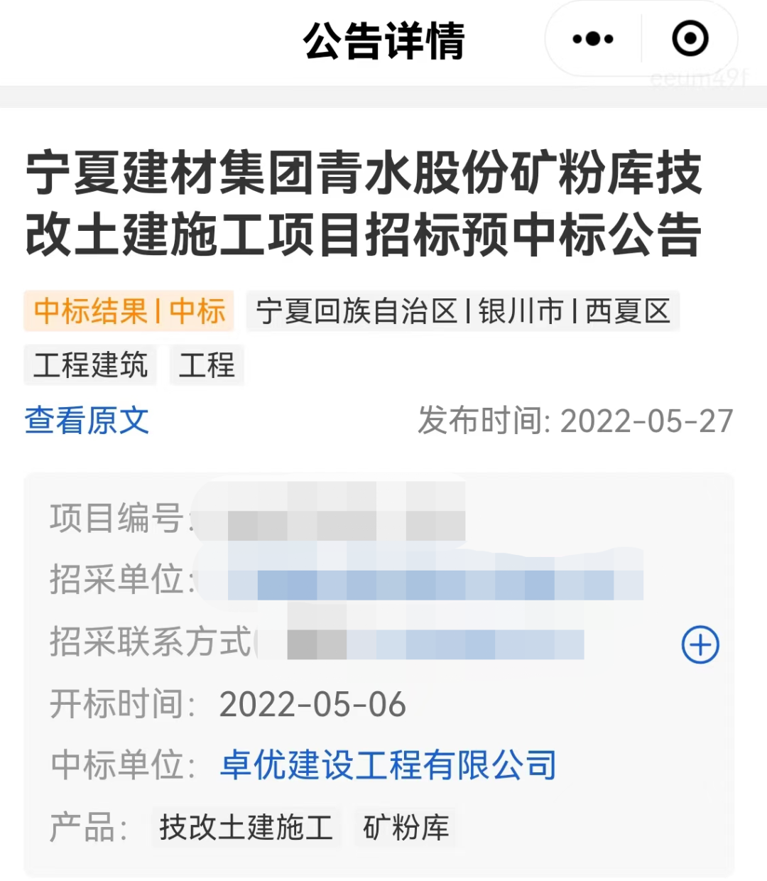 寧夏建材集團青水股份礦粉庫技改土建施工項目